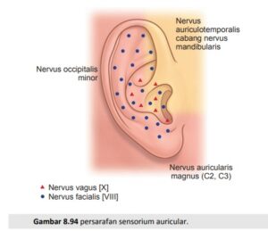 – Bagian auricula yang lebih dalam dipersarafi oleh nervus vagus [X] (cabang auricularis) dan nervus facialis [VII] (yang mengirim cabang ke ramus auricularis nervus vagus [X]).
