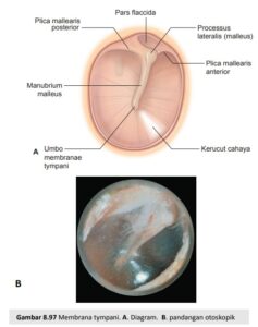 Superior dari umbo ke arah anterior ada perlekatan sisa manubrium mallei (Gambar 8.97), Pada perluasan paling superior dari garis perlekatan tersebut. terdapat penonjolan kecil pada membrana yang menandai letak processus lateralis malleus ketika berproyeksi pada permukaan internal membrana tympani. Meluas menjauhi penonjolan tersebut, pada permukaan dalam membrana, terdapat plica mallearis anterior dan posterior. Superior dari plicae tersebut terdapat bagian membrana tympani yang tipis dan kendor (pars filaccida). dan bagian membrana lain yang tebal dan tegang (pars tensa).