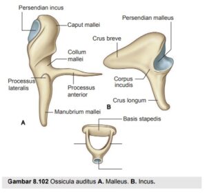 Tulang-tulang auris media terdiri dari malleus. incus. dan stapes. TuIang-tulang ini membentuk sebuah rantai tulang yang menyeberangi auris media, dari membrana tympani ke fenestra vestibuli auris interna
