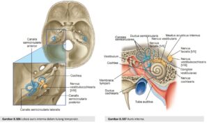 – Nervus Cochlearis, yang membawa impuls pendengaran yang berasal dari organon corti di dalam cochlea. Apparatus vestibular dan organon corti terletak didalam pars petrosa os temporalis.