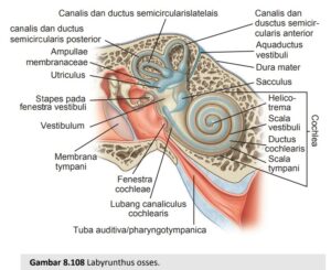 Terdiri dari dua saccus (utriculus dan sacculus) dan empat ductus (tiga ductus semicircularis dan ductus cochlearis), labyrinthus membranaceus mempunyai fungsi yang unik yang berkaitan dengan dan pendengaran (Gambar 8.110):