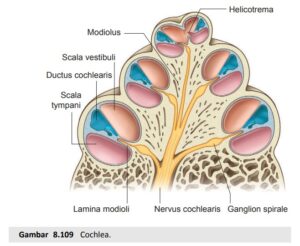 Berproyeksi ke jurusan anterior dari vestibulum adalah cochlea. yang merupakan struktur tulang yang membelit sebanyak 2-3 kali mengelilingi columna centralis tulang (modiolus). Susunan ini menghasilkan struktur berbentuk konus/kerucut dengan basis cochleae yang menghadap ke arah posteromedial dan apex yang menghadap ke anterolateral (Gambar 8.109)