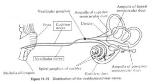 – Nervus Vestibularis, yang membawa impuls keseimbangan dan orientasi ruang tiga dimensi dari apparatus vertibular