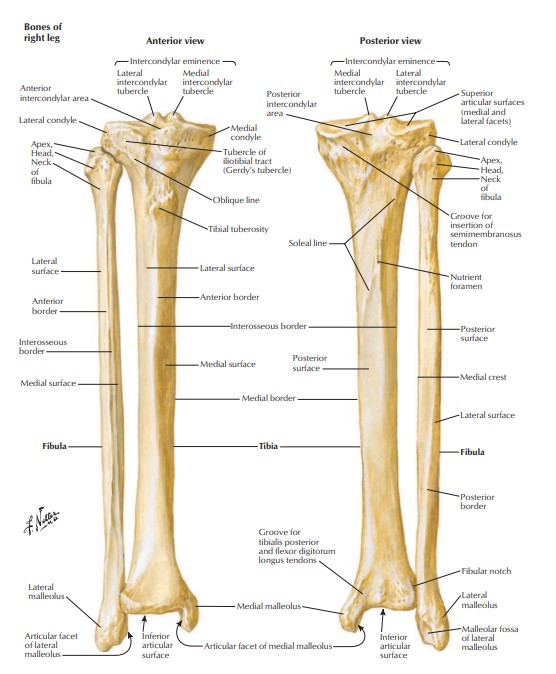 Os Tibia (Tulang Kering): Tulang besar di betis bagian medial. Memiliki Tuberositas tibiae dan Malleolus medialis (mata kaki dalam).Os Fibula (Tulang Betis): Tulang ramping di sisi lateral. Memiliki Caput fibulae dan Malleolus lateralis (mata kaki luar).