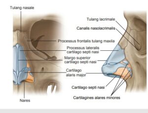 • sedikit kontribusi oleh tulang nasale di mana tulang tersebut bertemu pada garis tengah, dan spina nasalis tulang frontale; dan