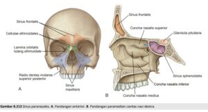 Terdapat 4 sinus paranasales-sinus ethmoidalis/ cellulae ethmoidales, dan sphenoidalis, maxillaris, dan frontalis. Tiap sinus diberi nama sesuai dengan tulang di mana sinus berada.
