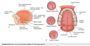 Dorsum linguae/facies superior atau pars oralis lingua tertutup oleh ratusan papillae linguales: