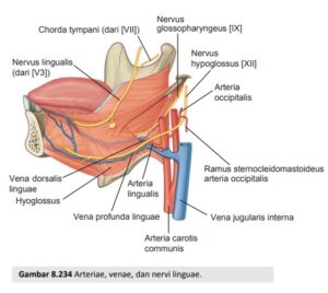 Arteri utama: A. lingualis (cabang dari A. carotis externa), bercabang menjadi: