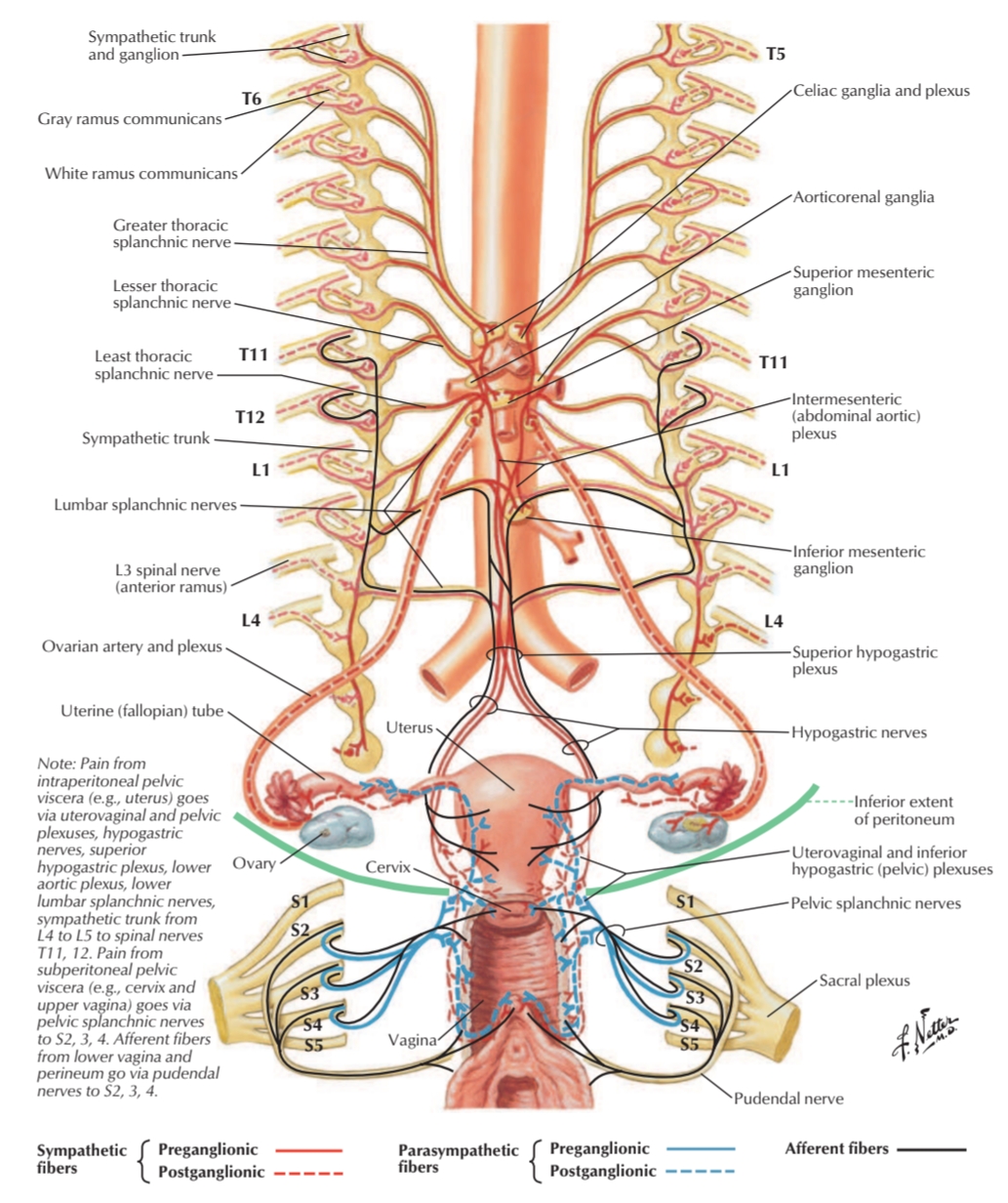 1.Simpatis → berasal dari T10–L1. Jalurnya dari serabut simpatis preganglionik melalui nervus splanchnicus thoracalis minor & imus (lesser & least) → menuju ke ganglia aorticorenal dan plexus ovarica → serabut postganglionik melingkari arteri ovarica menuju ovarium