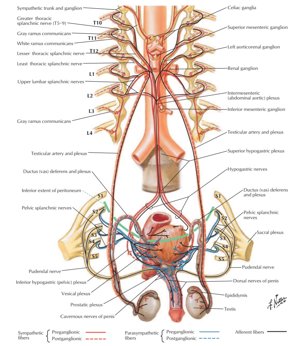 2. Parasimpatis → berasal dari S2–S4. Jalurnya mulai dari serabut preganglionik melalui nervus splanchnicus pelvic → lewat plexus prostaticus dan vesicalis → ke testis/vas deferens.