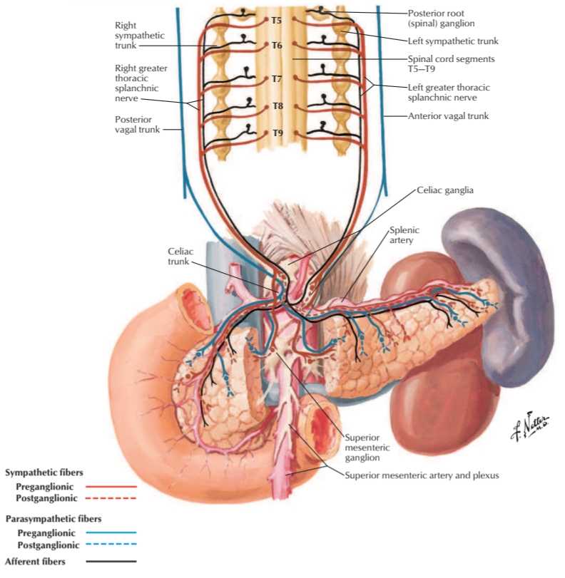 Asal: T5–T9 → serabut preganglionik → n. splanchnicus mayor → celiac ganglia → serabut postganglionik → masuk ke pankreas lewat plexus pancreaticus. Fungsinya: