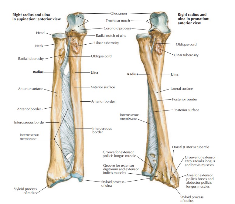 Os Ulna (Hasta): Terletak di sisi medial (lurus kelingking). Memiliki Olecranon (siku) dan Processus coronoideus.