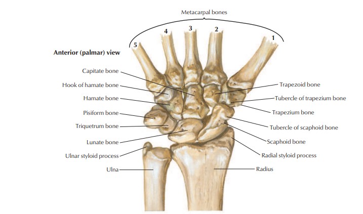 Carpalia (Pergelangan): 8 tulang kecil (Scaphoid, Lunatum, Triquetrum, Pisiforme, Trapezium, Trapezoid, Capitatum, Hamatum) .