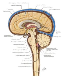 CSF adalah cairan jernih yang mengisi ventrikel otak, kanalis sentralis medulla spinalis, dan ruang subaraknoid. Total volume ±150 mL (mengalir dan diperbarui ±3 kali per hari).